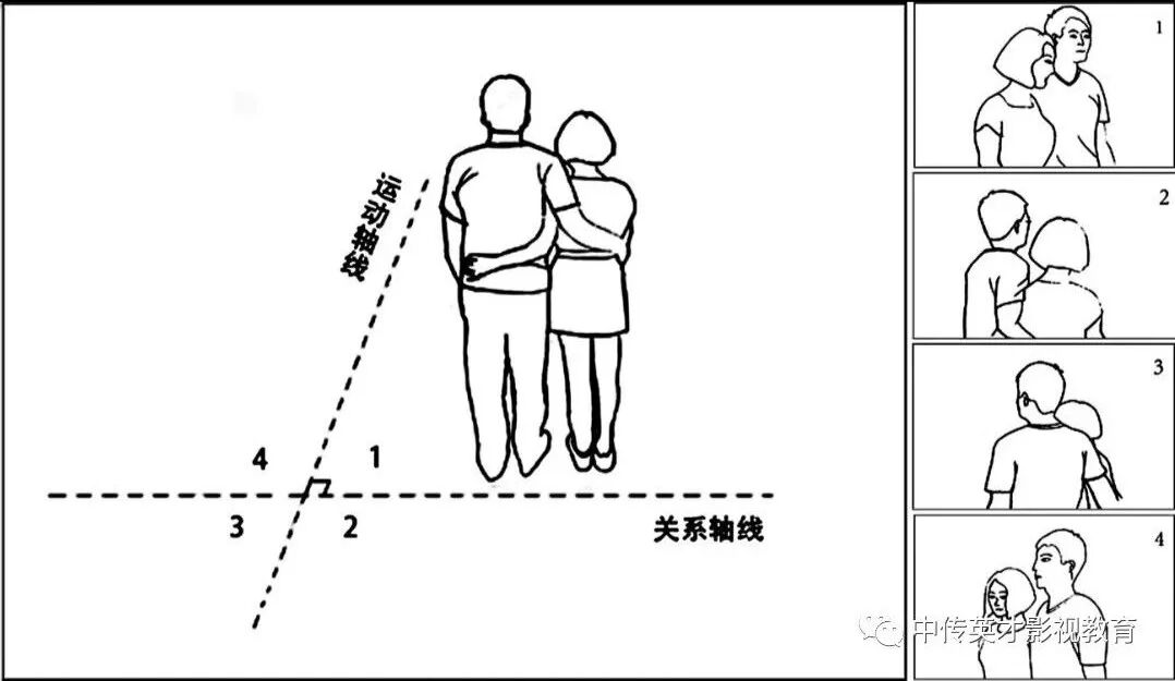 接下来我们改变组接顺序,1和4组接,2和3组接,这样虽然避免了跨越关系轴线,可是错误依旧会出现。在1和2的画面中,女在前,挡着男。在3和4的画面中,男的在前,挡着女的。如果1后面接4,或者2接3,虽然情侣都是面朝或者背朝观众,但前面镜头都是女的遮挡男的,后面镜头都是男的遮挡女的。男的什么时候跑到女的前面去了,并没有交代镜头。这样组接之所以会出现人物位置的跳跃,还是因为越轴,因为这样组接实际上跨越了情侣并肩走路形成的运动轴线。如果他们没有走路,那么共同的视线方向仍然是轴线。除非摄像机就架设在情侣走路的正前方,否则在1、2、3、4无论哪个区架设机位,拍摄的画面都会存在谁在前,谁在后的问题,也就是总会出现一个人挡着另一个人,那么越轴就不可避免。总之,这种构图条件下将1、2、3和4区镜头随意组接在一起,结果将会非常搞笑,要么左右是反的,要么前后是反的,要么前后左右都是反的。