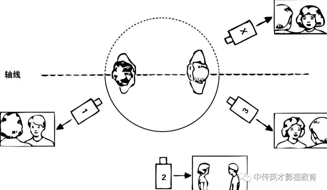 在拍摄时的机位设置,要遵守轴线规律,即在轴线的一侧区域内设置机位。不论拍摄多少镜头,摄像机的机位和角度如何变化,镜头运动如何复杂,从画面上看,被摄主体的运动方向和位置关系总是一致的,否则就称之为“越轴”或“跳轴”。比如前一个镜头中人物A在左侧,人物B在右侧,如果下一个镜头出现B在左侧,A在右侧,就是越轴了。