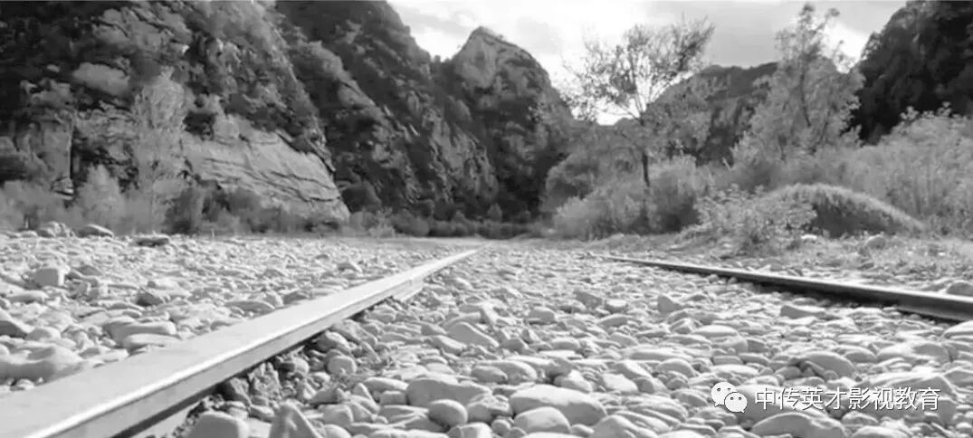 以《让子弹飞》开篇麻匪劫火车那段为例,如图7-1。镜头1是一只鹰在山间上下翻飞,是远景的交代镜头。镜头2是两山夹一沟,沟里有一段没有枕木和路基的铁轨,机位是贴近地面拍摄的近景镜头。听觉上配上几声鹰的鸣叫,悠扬的《送别》从远处传来。这些镜头都是表现景物的,为接下来抢劫火车的剧情作地理环境的铺垫。镜头3的景别和视角都没有发生明显的变化,只是突然冒出小六子的后脑勺,背对着镜头,伏在铁轨上听声音。镜头4里小六子掏了掏耳朵,然后又转过头冲着镜头,继续听铁轨传来的声音,接着传来马蹄声。在景别没有变化的前提下,小六子的突然出现就把人物融入景物,视觉中心非常自然地从景物转换成人物,人物从景中跳出,开始一段新的叙事。后面接的是小六子循声望去,看到火车的烟囱,火车上插着的旗帜、车窗伸出来的枪支和车厢压过某段铁轨的特写镜头。镜头角度一转,出现马拉火车的远景,这个镜头后面跟着的就是在火车上吃火锅的那场戏。