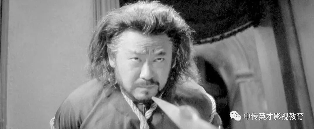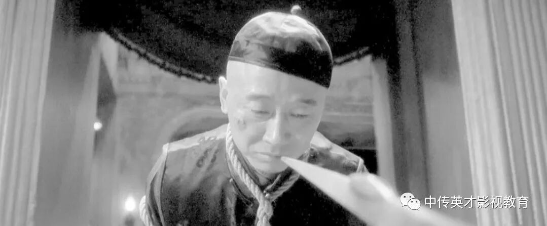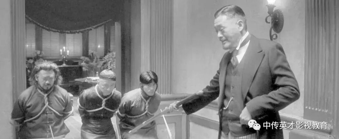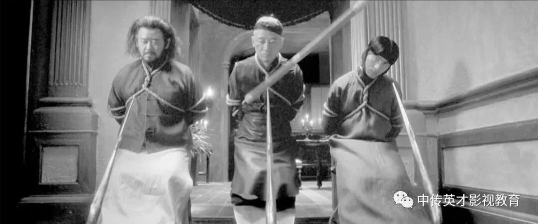 第二段的情节点是黄四郎让三个替罪羊自裁。主镜头2-1以绑着跪在竹签子前的团练教头武智冲、管家胡万和卖汤粉的亮相作为开场。副主镜头有六个:一个是县长看到三个替罪羊的反应镜头2-2;后面接黄四郎持刀逼问三个替罪羊是否告发他的镜头2-3;然后是三个替罪羊的表情的小特写,从2-4到2-6,反映他们的心理活动;最后一个镜头转了角度,拍了县长操起短刀的近景动作镜头2-7。在叙事结构上,前面还是典型的“M+C+C+C+…”,后面又回到了“…+C+C+C+M”,因为这个情节点结束后的主镜头与开始时的主镜头有些雷同,构图都是小全景,起到承前启后的作用。这段的高潮点是卖汤粉的瑟瑟发抖,三个人中只有他是真的害怕。这个情节点六个副主镜头只给了黄四郎一个镜头2-3,还是个半身景。而给县长的镜头有两个,一个反应镜头2-2和一个操起短刀的动作镜头2-7,给的都是近景。通过增加县长镜头的数量和时长,加上小景别镜头的强调,以及操刀动作的强化,扭转了县长与黄四郎在心理较量过程中的劣势,县长操刀与后面的换刀,在心理较量过程中县长已经处于主动地位。
