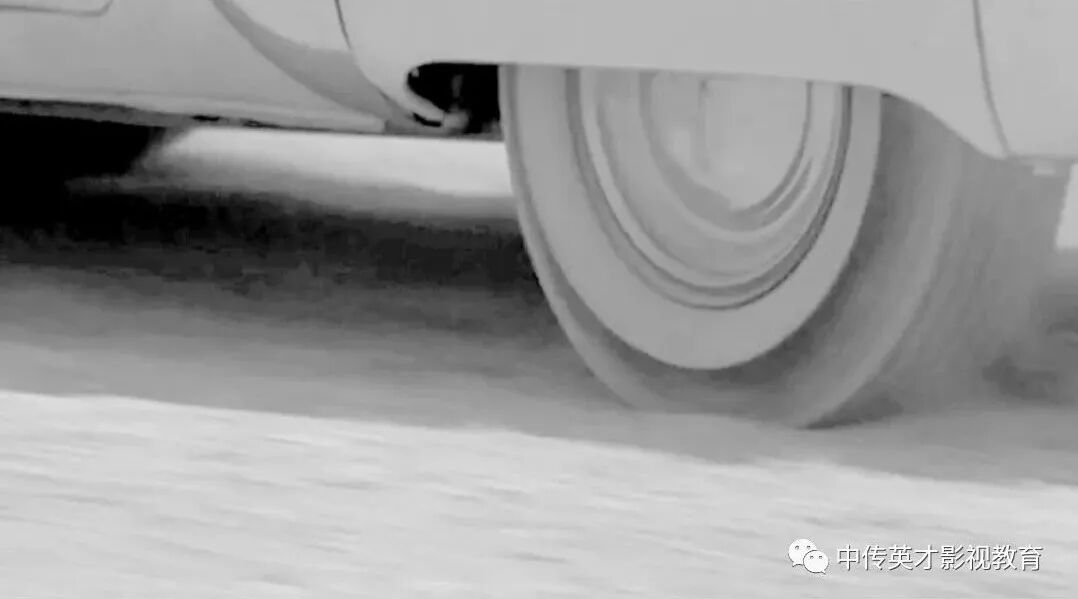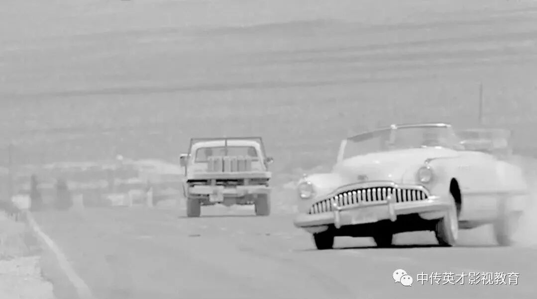 美国电影《雨人》(1988年)讲述的是弟弟查理·巴比特发现父亲将遗产留给了患自闭症哥哥雷蒙·巴比特,便计划骗取这笔财富,并利用哥哥超强的记忆力去赌博赢钱。但在此过程中,血缘的亲情打破了原有的疏离,真挚动人的手足之情取代了查理原先只求一己利益的私心。在去往加州的路上,查理发现雷蒙对扑克牌有过目不忘的能力,便改道去拉斯维加斯赌牌。无论是在剧情上还是剪辑段落上,这里都是转折,需要加转场作为过渡,以保持内容段落的间隔和画面过渡的流畅。这个转场用的就是出入画转场,如图8-1。镜头1是发动汽车,然后镜头2是汽车引擎盖上的扑克牌被吹散到空中,镜头3是轮胎转动的特写。到了镜头4,弟弟查理驾车从画右驶向画左。镜头5又是轮胎的特写,然后向左驶出画面。镜头6是他们驾驶汽车的远景,从画右进入画面,然后在镜头7中转了个弯,到了镜头8中向观众驶来。后面就是汽车穿越荒漠,来到赌城拉斯维加斯。在镜头5中汽车从左侧出画,这时他们才刚离开汽车旅馆,紧接着在镜头6中右侧入画,汽车已经进入荒漠,到了通往拉斯维加斯的路上。