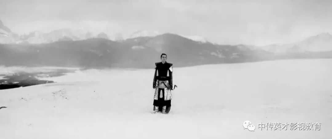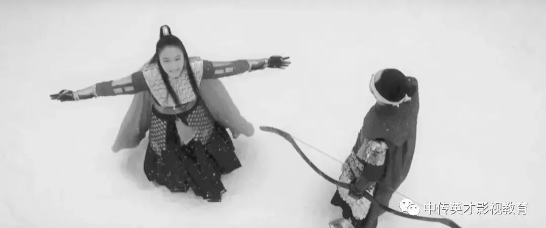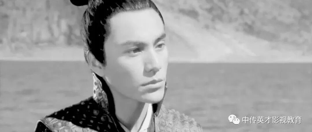 镜头14是一个背向镜头,霍心仍旧注视着画外,保持他陷入回忆前的姿势,只是摄像机拍摄方向变化了。镜头15给了靖公主正面镜头和霍心的半张脸,与之前镜头5的姿势呼应,为了避免镜头重复,镜头15中摄像机拍摄方向变化了,这样构图的目的是要把之前中断了的叙事捡起再续。镜头16霍心转身侧向迎着观众,叙事进程跳出了闪回剧情,回到现实的叙事场景中来。