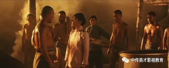 这段情节所有的镜头都在塑造这群粗犷的汉子们有声有色的群像。唱歌是粗犷性格的内在体现,镜头是外在形象的表现。两种手段集中在一起,产生强烈的戏剧性效果。