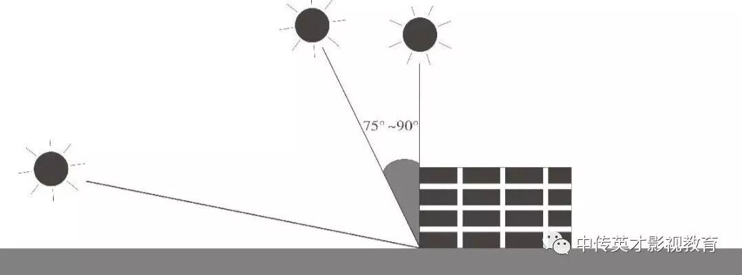 (1)我们将太阳从地平线上升起到与地平面约呈15°夹角时段称为早晨(见1)。早晨的光照特点为:太阳升起前是散射光,光线柔和,为散射光,如图2所示;垂直景物的受光面照度高、亮度大,而其他景物或景物背光面则照度低、亮度小。整个画面明暗反差较大,投影长,色温低(2800 K~3400 K),如图3所示。