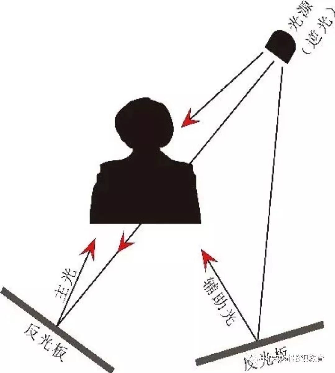 反射式布光法是指在演播室内仅设置一个光源,依靠反光板的反射光线而获得其他布光点的布光方式。根据光源位置不同,可将此布光法分为以下三种方式: